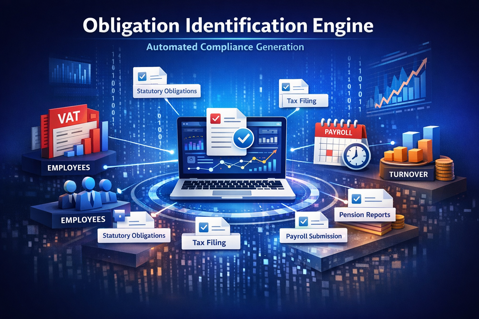 The platform automatically generates statutory obligations based on business data such as VAT status, payroll cycles, turnover, and employee count. It continuously updates obligations as business conditions change, removing the need for regulatory knowledge.