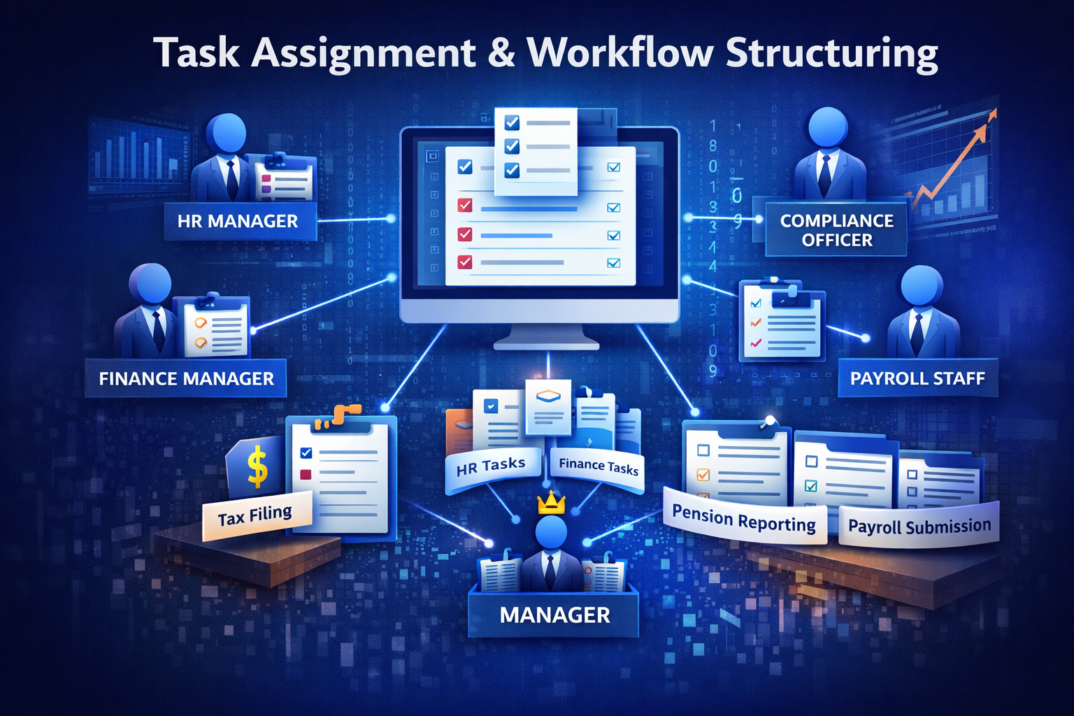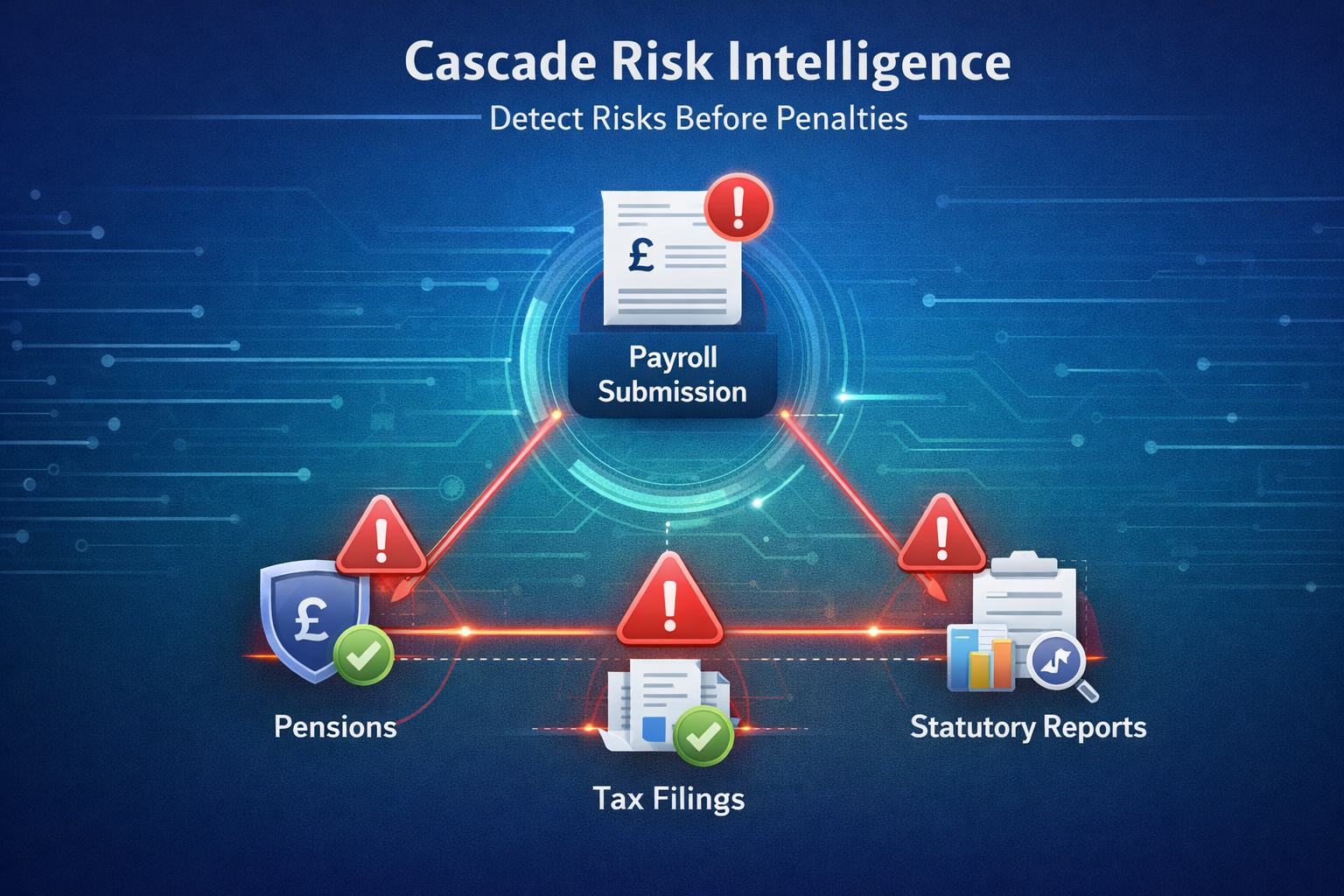 The platform models dependencies between obligations. A delay in one task (e.g., payroll submission) automatically triggers risk signals in related areas such as pensions, tax filings, and statutory reports.