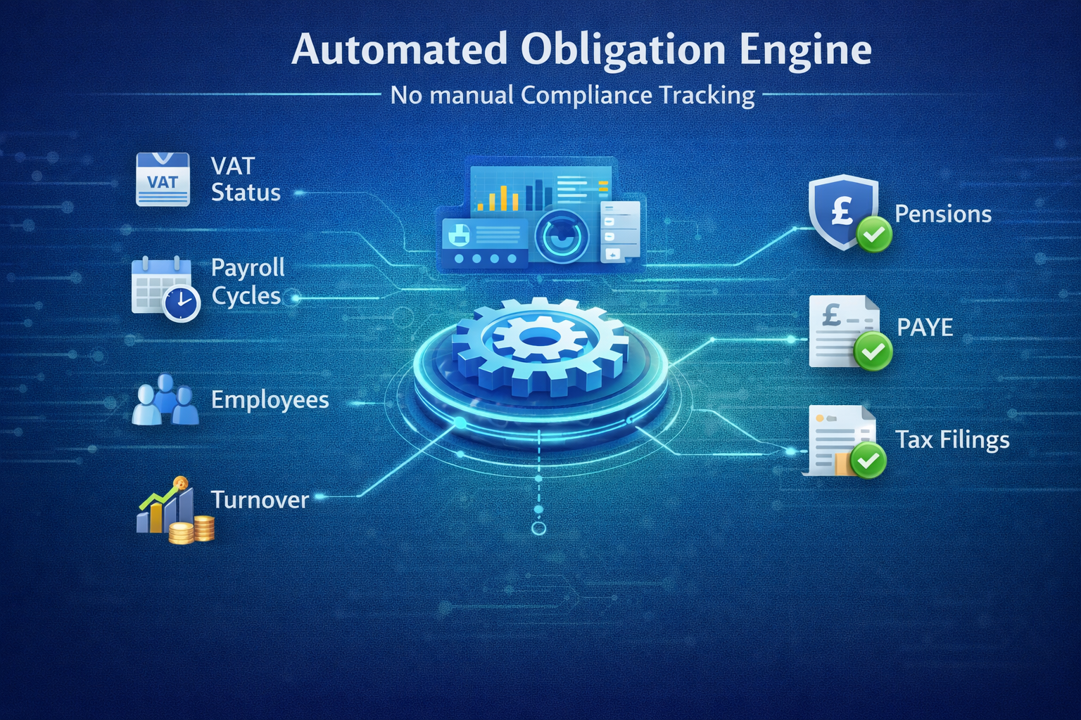 The platform automatically analyses business data such as VAT status, employee count, payroll cycles, and turnover to generate all applicable statutory obligations. This removes the need for regulatory knowledge and ensures nothing is missed.