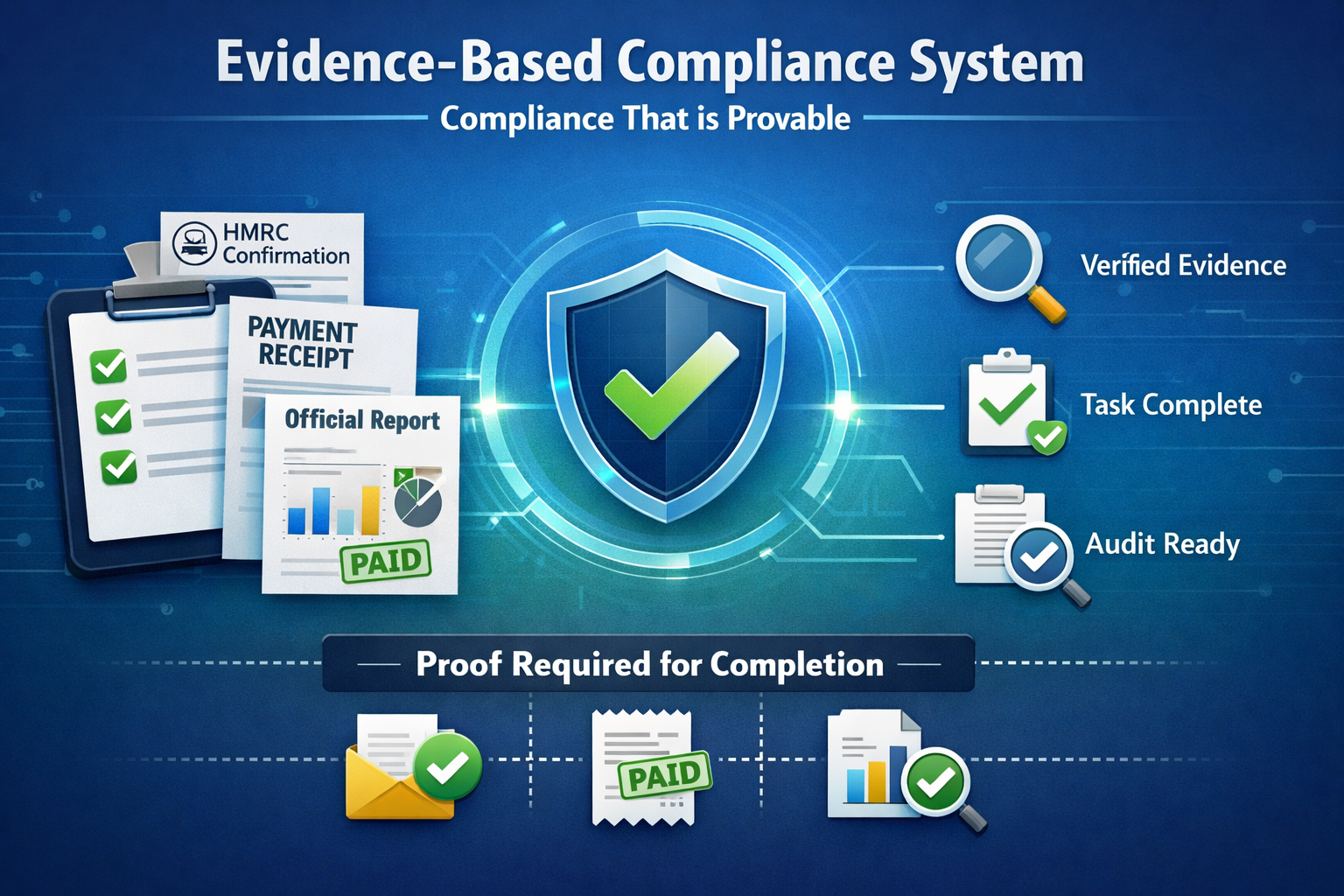 Tasks cannot be marked complete without validated evidence such as HMRC confirmations, payment receipts, or official reports. This ensures every compliance action is verifiable and audit-ready at all times.